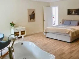 Er zijn 3 ruime gastenkamers van +/- 35 m2 tot 45 m2 groot. 2 kamers voor 2 personen, en 1 kamer voor 4 personen. Iedere kamer heeft een een groot kingsize bed en een eigen badkamer met stortdouche en een bad.