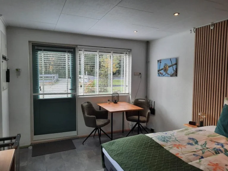 Het comfortabele gastenverblijf heeft beneden een 2-persoons boxspringbed, een eettafel en een keuken met o.a. gasfornuis, oven en koelkast. In de badkamer vind je een douche, wastafel en toilet. Boven is nog een eenpersoonsbed. De B&B heeft een eigen terras met uitzicht op de tuin en er is een afgesloten fietsenstalling waar je je elektrische fiets op kan laden. Eventueel zijn er gratis 2 fietsen beschikbaar.