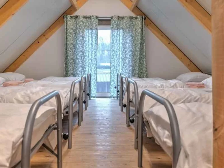 mogelijkheid tot gezellig samenzijn. Op de afsluitbare slaapzolder, die enkel toegankelijk is voor de gasten, bevinden zich 8 luxe 1-persoonsbedden met comfortabele matrassen. De gehele bovenverdieping heeft een sfeervolle houten vloer en verwarming.