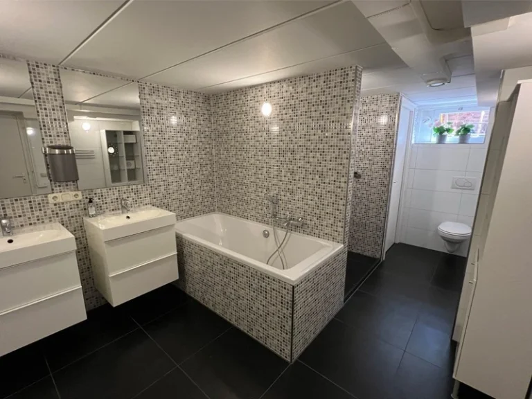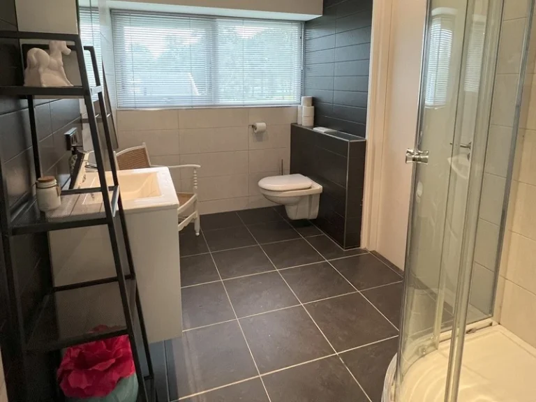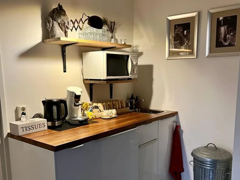 De gasten hebben toegang tot een ruime hal met daarin een kitchenette. Hier vind je een koelkast, magnetron, waterkoker, Senseo, borden, glazen en bestek. Koffie en thee kun je onbeperkt pakken. Op de eerste verdieping vind je de heerlijke gastenkamers. Een zeer ruime en een wat kleinere. Ensuite aan de grote kamer is een luxe badkamer voorzien van toilet, wastafel en een heerlijke douche. Deze badkamer is ook vanuit de gang toegankelijk voor de bewoners van de kleinere kamer.